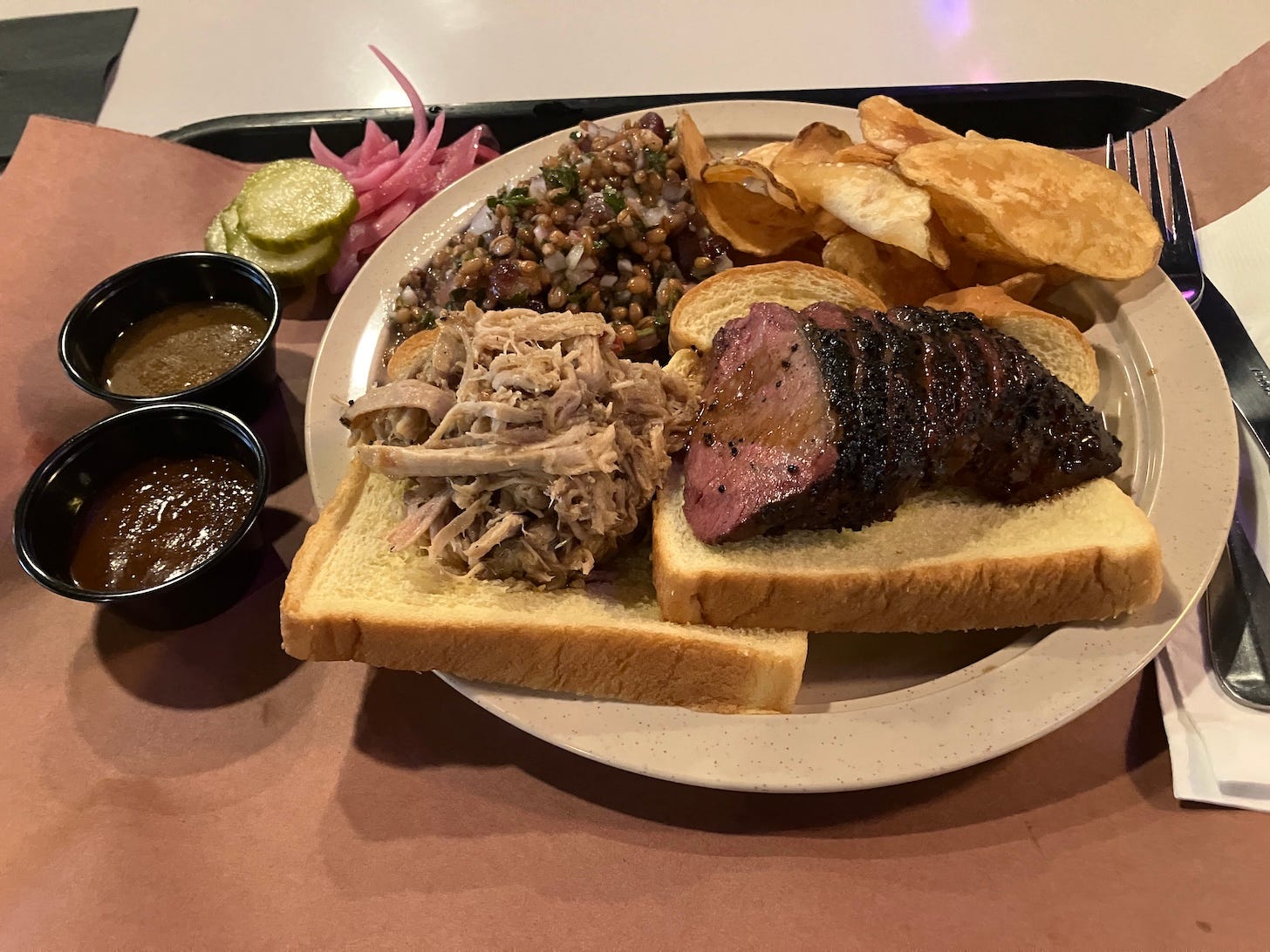 Now, don’t tell Meathead this, but I actually have been known to enjoy a glass of wine with barbecue every now and then. In fact, when I visited Austin back in July, I enjoyed this fine platter of smoked tri-tip and whole hog at Leroy & Lewis.