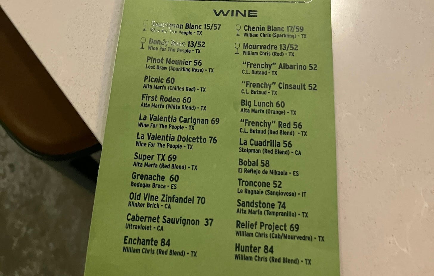 That’s an excellent Mourvèdre red from William Chris Vineyards in Hye, Texas, and it was a spot-on pairing for the smoky beef. Leroy & Lewis, in fact, has a quite impressive list of wines, all from Texas vineyards.