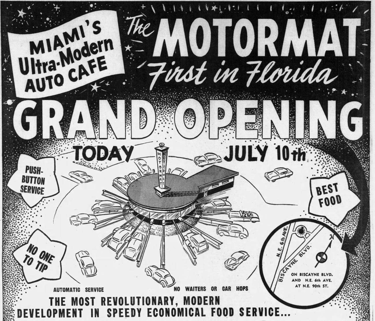 The Miami Motormat was defunct by within a year, and its space was taken over after “extensive alterations” by a restaurant called the Pickin’ Chicken, which featured fried chicken along with—can you guess?—barbecued chicken and ribs. Perhaps the Motormat’s complicated conveyor belt system was too prone to breakage, or maybe customers just missed ogling the carhops, but I can find no trace of the “ultra-modern auto cafe” after 1951.